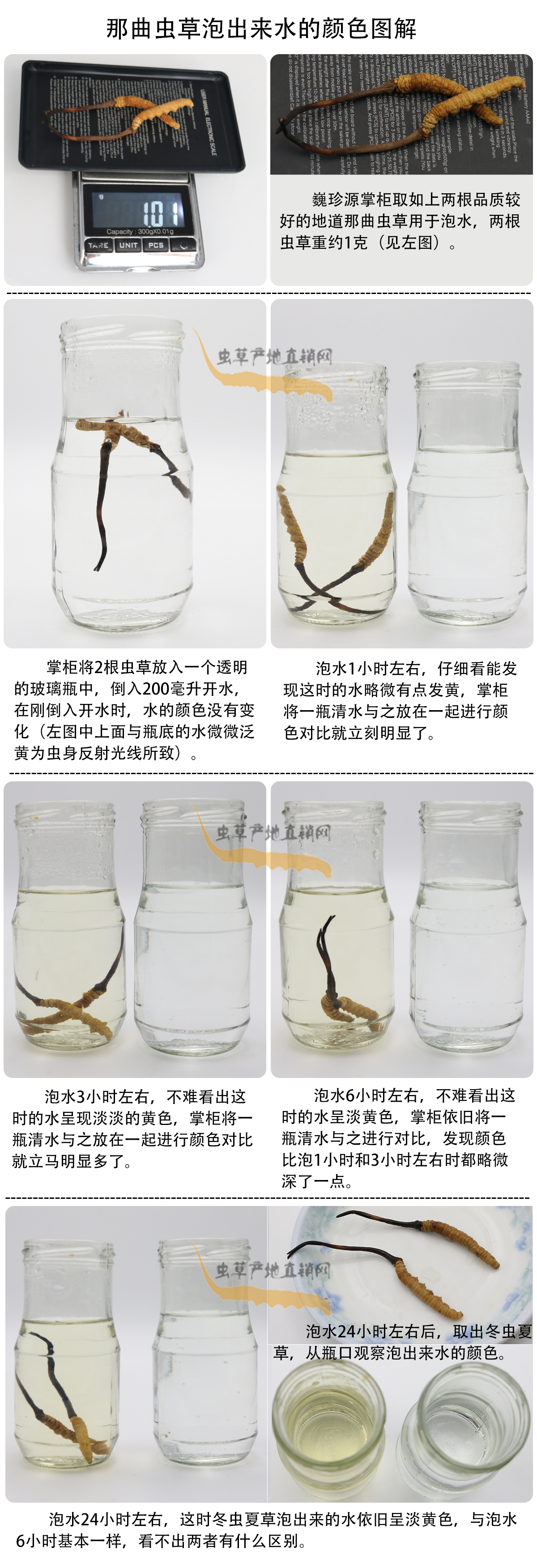 冬蟲夏草泡水是最常用的服用方法,有些細(xì)心的顧客在冬蟲夏草泡水過程中觀察水的顏色變化,并向我們提出了一些疑問。為了掌握第一手資料,更客觀準(zhǔn)確的回答大家的疑問,巍珍源掌柜親自試驗(yàn)冬蟲夏草泡水過程(以那曲冬蟲夏草作為試驗(yàn)樣本),并拍下水的顏色變化照片,請(qǐng)大家先看照片,然后巍珍源掌柜再就幾個(gè)重要問題進(jìn)行解答,照片如下: